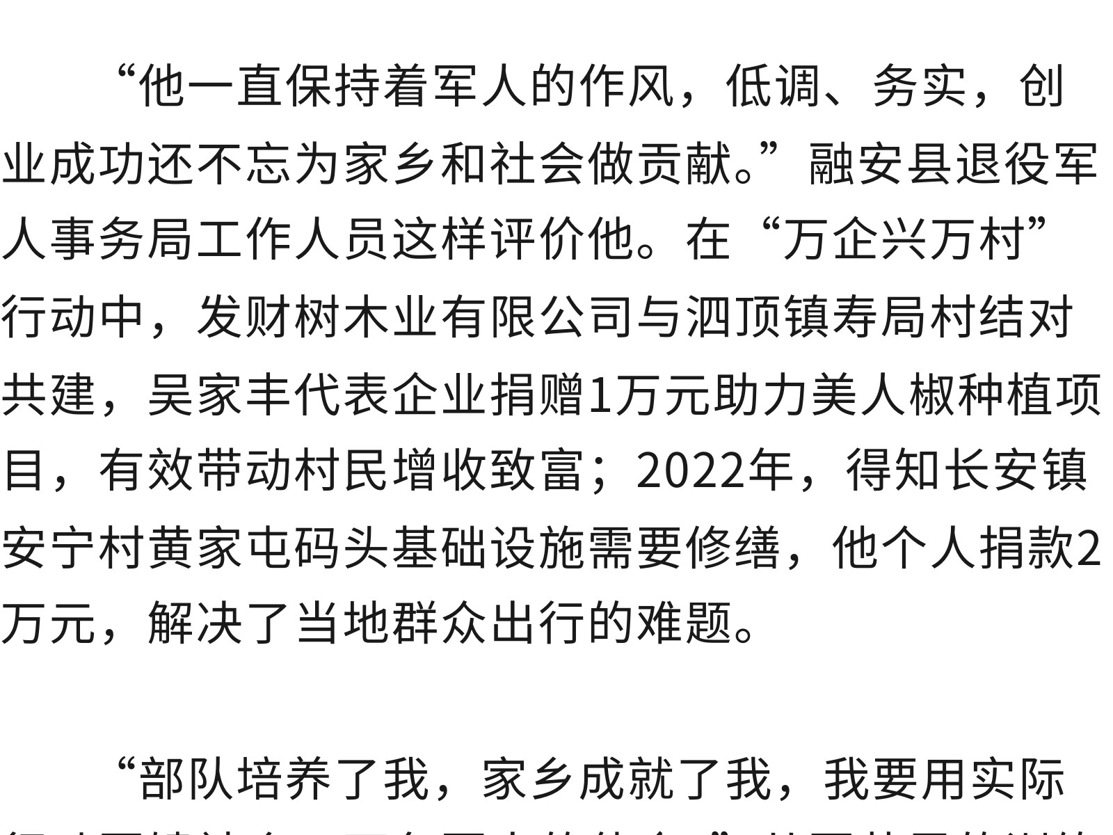 【最美退役軍人】從軍營硬漢到創(chuàng)業(yè)先鋒——記廣西優(yōu)秀退役軍人吳家豐 發(fā)布時間:2025年09月19日 09時來源:本站原創(chuàng)瀏覽:62 人次
