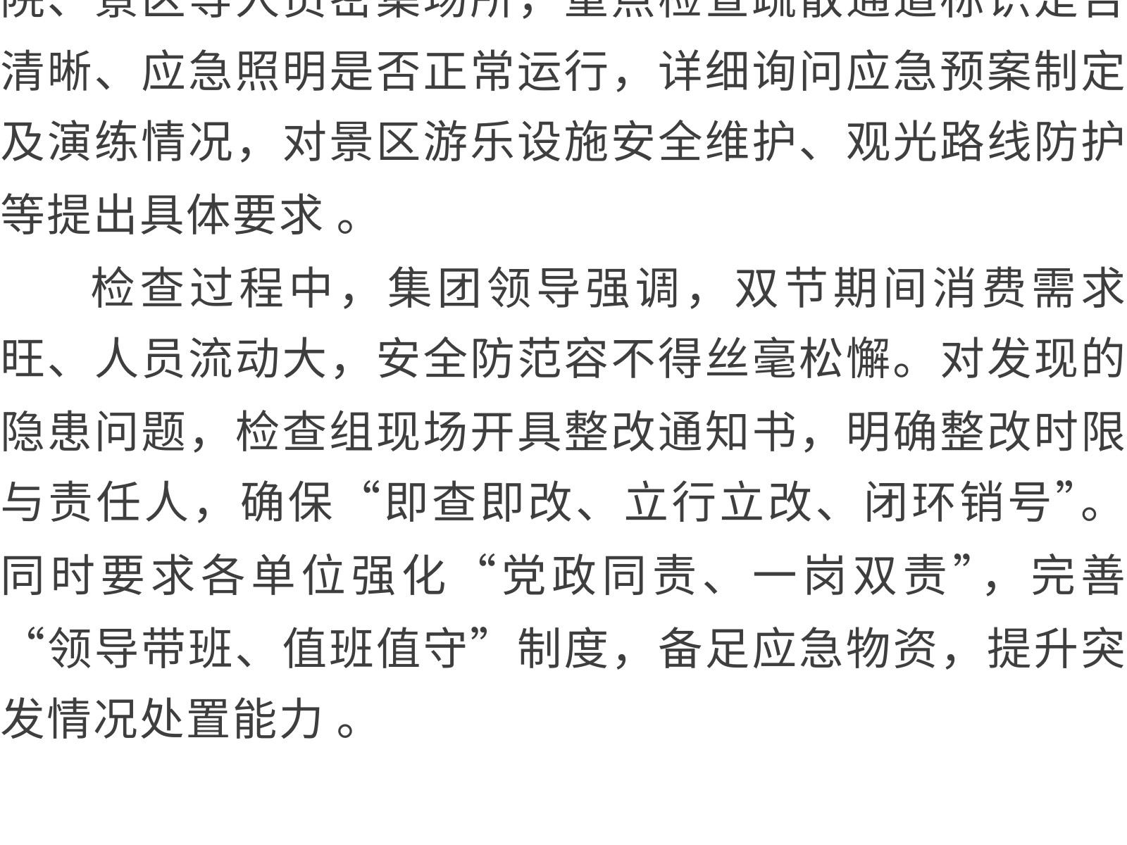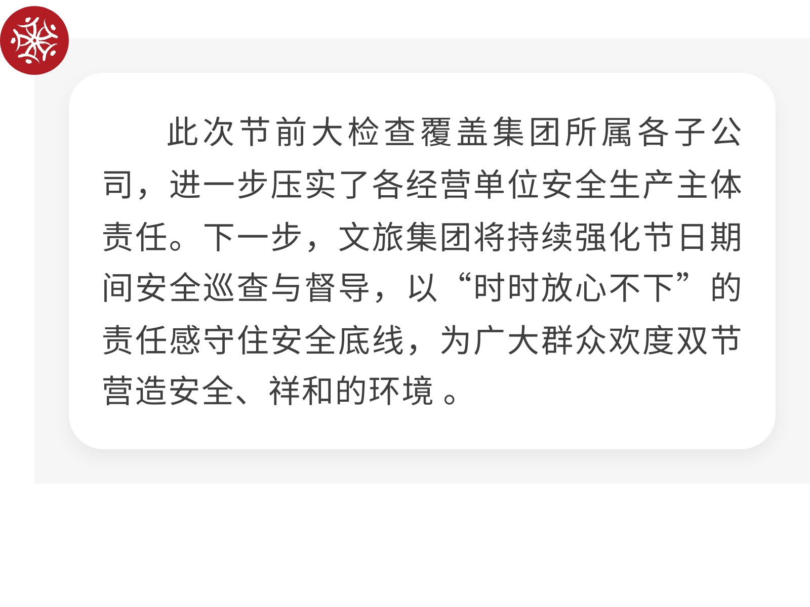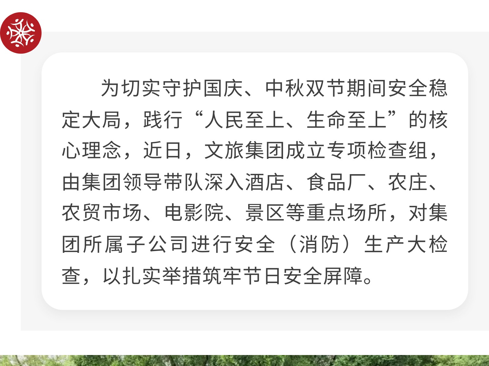 【筑牢安全防線 護航雙節(jié)安寧】文旅集團開展節(jié)前安全(消防)生產(chǎn)大檢查 發(fā)布時間:2025年09月30日 17時來源:本站原創(chuàng)瀏覽:89 人次