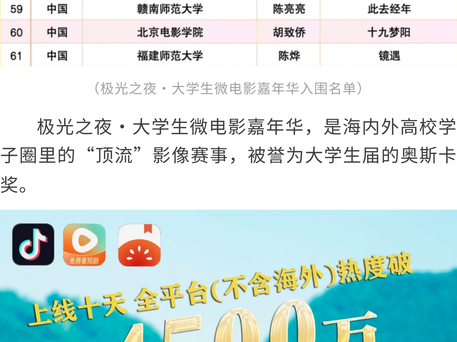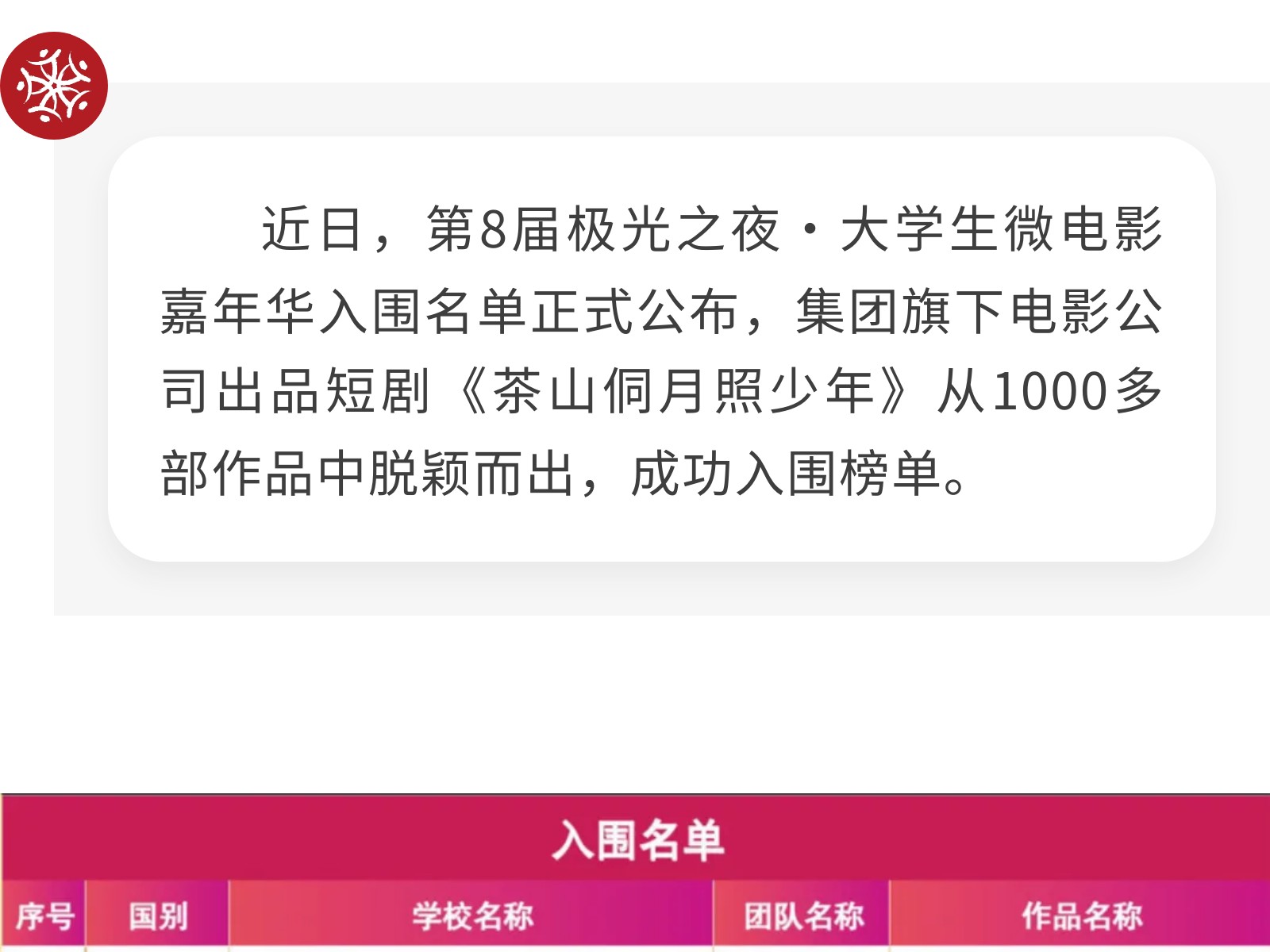 喜報!集團旗下電影公司出品短劇《茶山侗月照少年》入圍第8屆極光之夜·大學(xué)生微電影嘉年華 發(fā)布時間:2025年10月14日 15時來源:本站原創(chuàng)瀏覽:54 人次