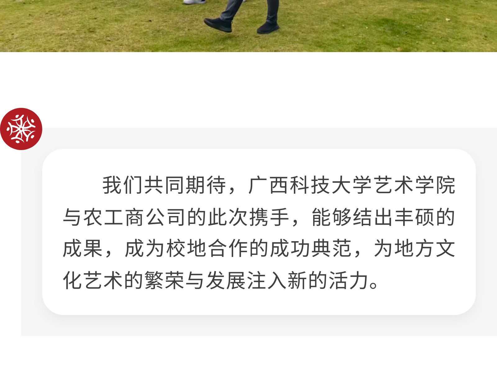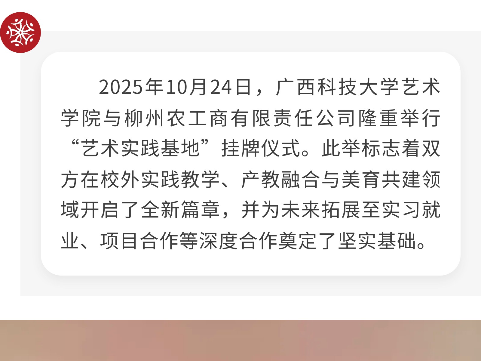 【校企攜手 共育英才】廣西科技大學(xué)藝術(shù)學(xué)院與柳州農(nóng)工商公司正式簽署校企合作協(xié)議 發(fā)布時間:2025年11月02日 10時來源:本站原創(chuàng)瀏覽:48 人次