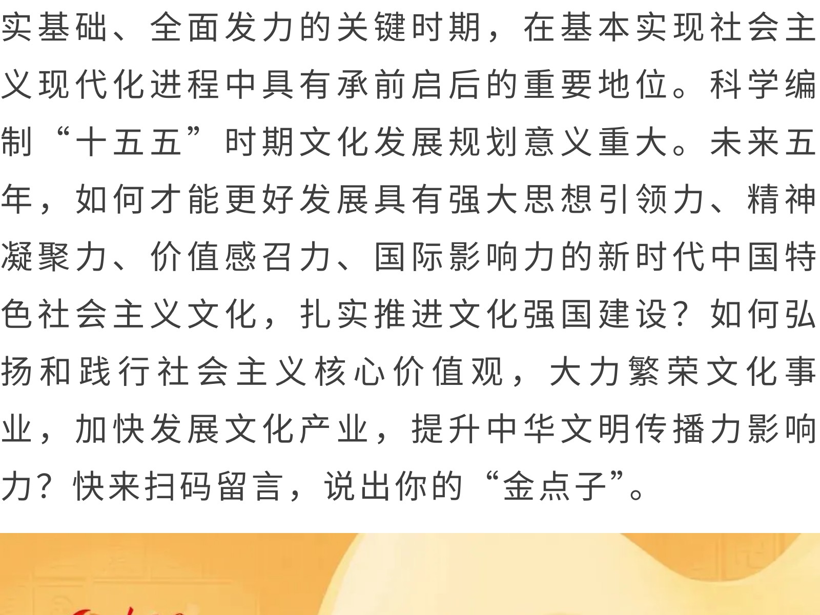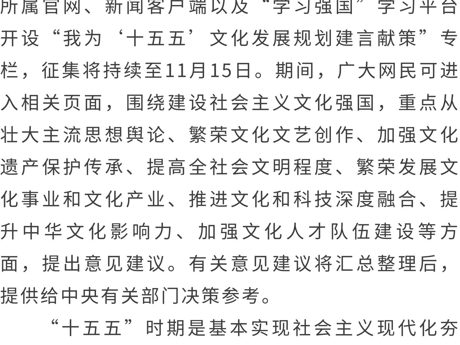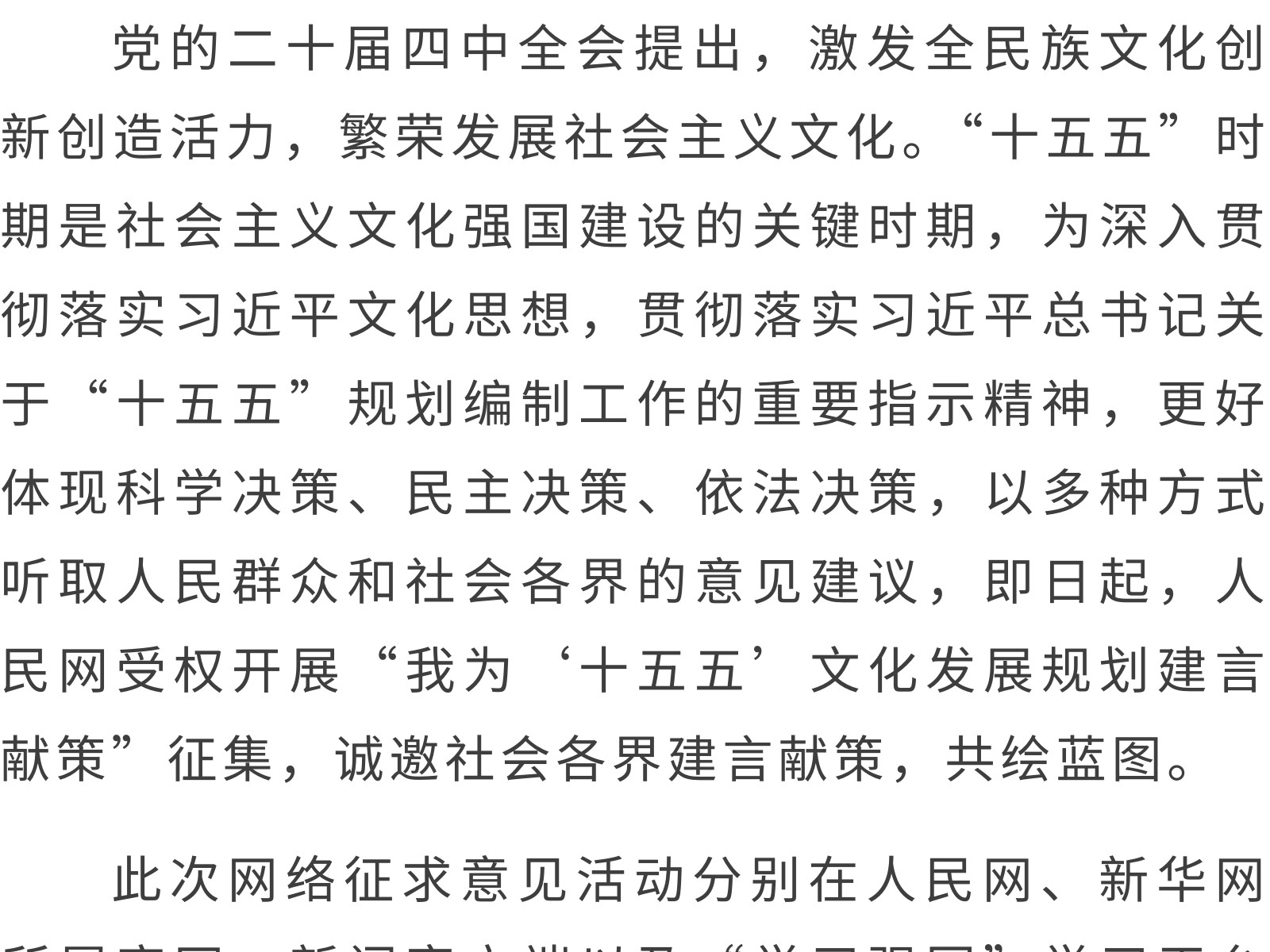 “十五五”文化發(fā)展規(guī)劃編制工作開展網(wǎng)絡(luò)征求意見活動 發(fā)布時間:2025年11月11日 11時來源:本站原創(chuàng)瀏覽:69 人次
